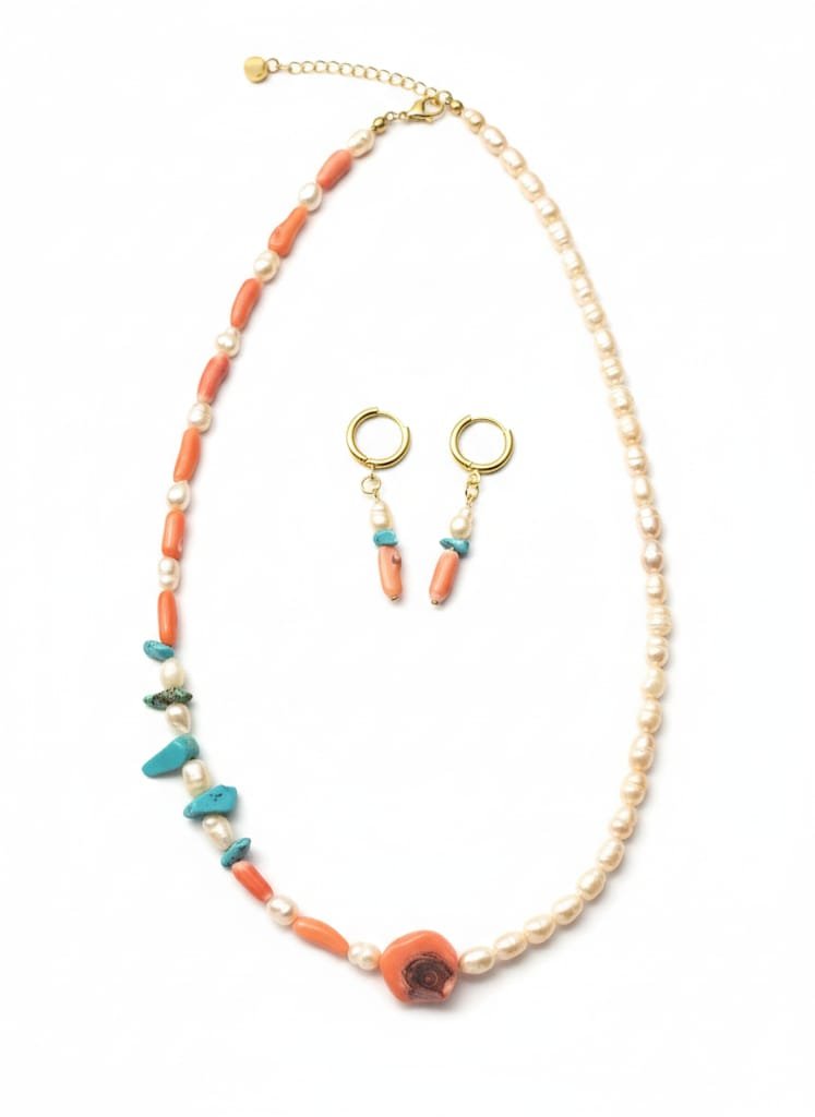 A+ kalite gerçek Tatlı su İncileri, doğal Pembe Mercan ve Kırık Turkuaz taşları kullanılmıştır. Takım; bir adet kolye ve bir çift küpeden oluşmaktadır. Tüm metal aksamlar Lumena By Khan kalite standartlarında, kararmaya dayanıklı ve %100 paslanmaz çelik malzemelerden üretilmiştir.