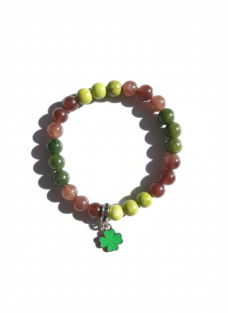 A+ kalite doğal Çilek Kuvars(8mm), Yeşim(mm) ve Serpentin(8mm) taşları kullanılmıştır. Yüksek mukavemetli, uzun ömürlü esnek misina üzerine spiritüel bir niyet ve titizlikle dizilmiştir.
