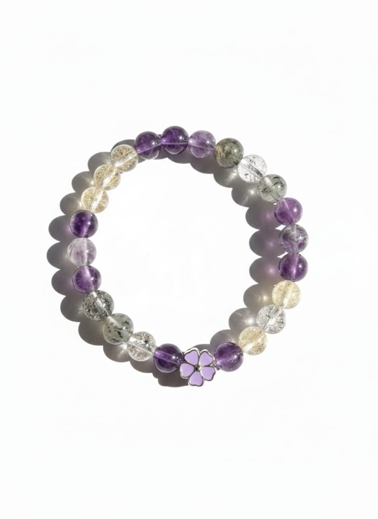 A+ kalite doğal Ametist(8mm), Necef(8mm) ve Rutil Kuvars(8mm) taşları kullanılmıştır. Yüksek mukavemetli, uzun ömürlü esnek misina üzerine yüksek spiritüel niyetlerle titizlikle dizilmiştir.